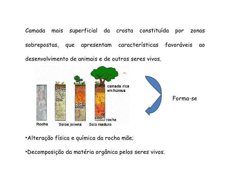 99. 99. Camada mais superficial da crosta constituída por zonas sobrepostas, que apresentam características favoráveis ao desenvolvimento de animais e de outros seres vivos. <ul><li>Alteração física e química da rocha mãe; </li></ul><ul><li>Decomposição da matéria orgânica pelos seres vivos. </li></ul>Forma-se