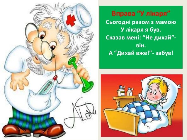 11. 11. Вправа “У лікаря” Сьогодні разом з мамою У лікаря я був. Сказав мені: “Не дихай”- він. А “Дихай вже!”- забув!