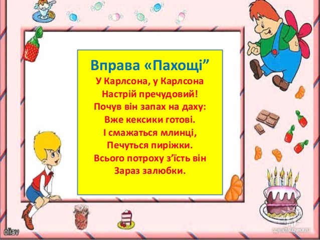 14. 14. Вправа «Пахощі” У Карлсона, у Карлсона Настрій пречудовий! Почув він запах на даху: Вже кексики готові. І смажаться млинці, Печуться пиріжки. Всього потроху з’їсть він Зараз залюбки.