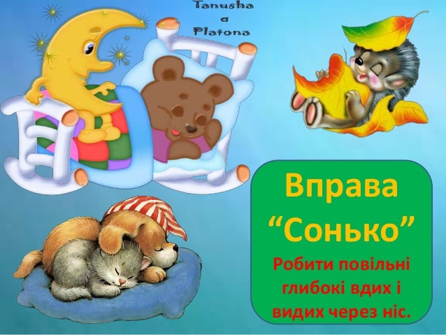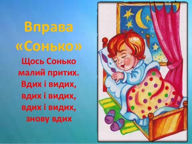 17. 17. Вправа «Сонько» Щось Сонько малий притих. Вдих і видих, вдих і видих, вдих і видих, знову вдих
