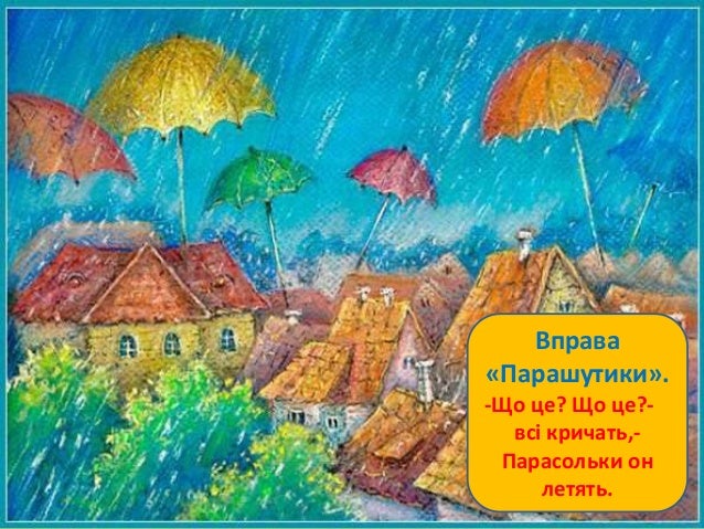 19. 19. Вправа «Парашутики». -Що це? Що це?- всі кричать,- Парасольки он летять.