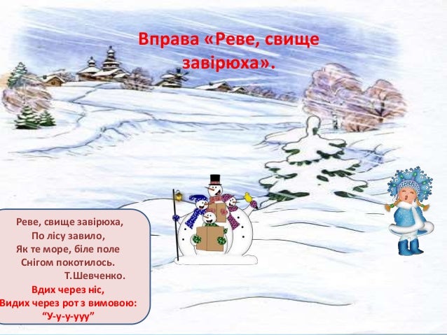 23. 23. Вправа «Реве, свище завірюха». Реве, свище завірюха, По лісу завило, Як те море, біле поле Снігом покотилось. Т.Шевченко. Вдих через ніс, Видих через рот з вимовою: “У-у-у-ууу”