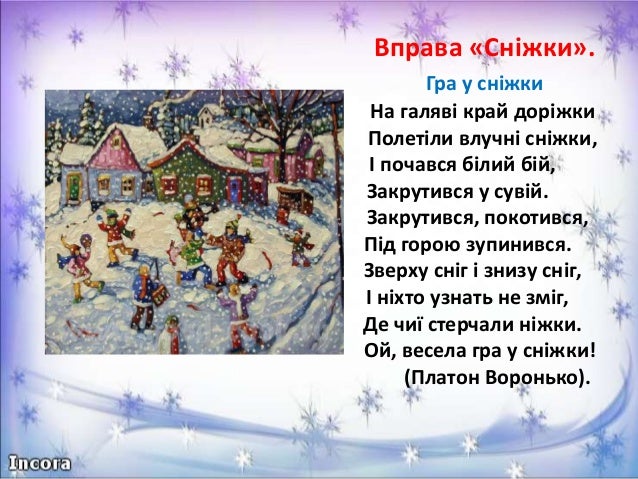 25. 25. Вправа «Сніжки». Гра у сніжки На галяві край доріжки Полетіли влучні сніжки, І почався білий бій, Закрутився у сувій. Закрутився, покотився, Під горою зупинився. Зверху сніг і знизу сніг, І ніхто узнать не зміг, Де чиї стерчали ніжки. Ой, весела гра у сніжки! (Платон Воронько).