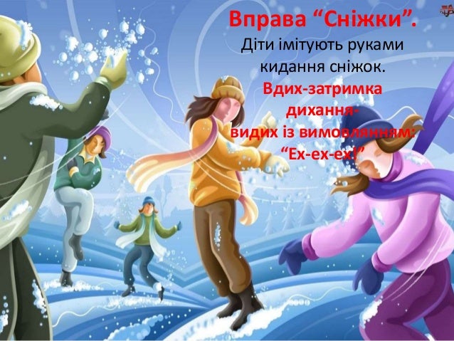 26. 26. Вправа “Сніжки”. Діти імітують руками кидання сніжок. Вдих-затримка дихання- видих із вимовлянням: “Ех-ех-ех!”