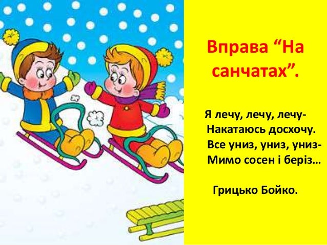 29. 29. Вправа “На санчатах”. Я лечу, лечу, лечу- Накатаюсь досхочу. Все униз, униз, униз- Мимо сосен і беріз… Грицько Бойко.