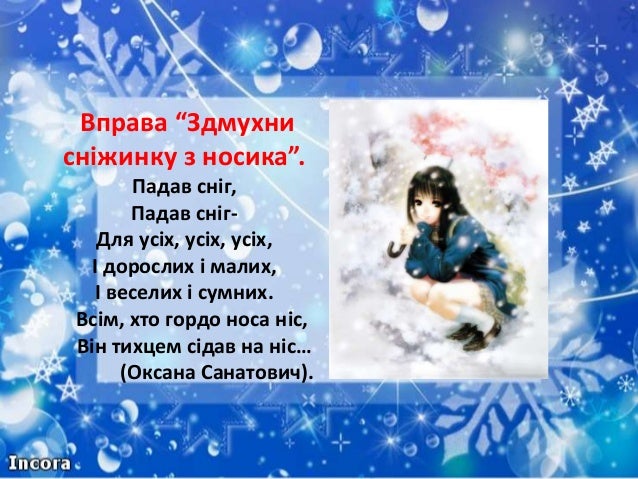 31. 31. Вправа “Здмухни сніжинку з носика”. Падав сніг, Падав сніг- Для усіх, усіх, усіх, І дорослих і малих, І веселих і сумних. Всім, хто гордо носа ніс, Він тихцем сідав на ніс… (Оксана Санатович).
