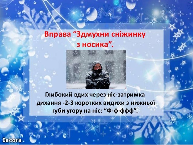 32. 32. Вправа “Здмухни сніжинку з носика”. Глибокий вдих через ніс-затримка дихання -2-3 коротких видихи з нижньої губи угору на ніс: “Ф-ф-ффф”.