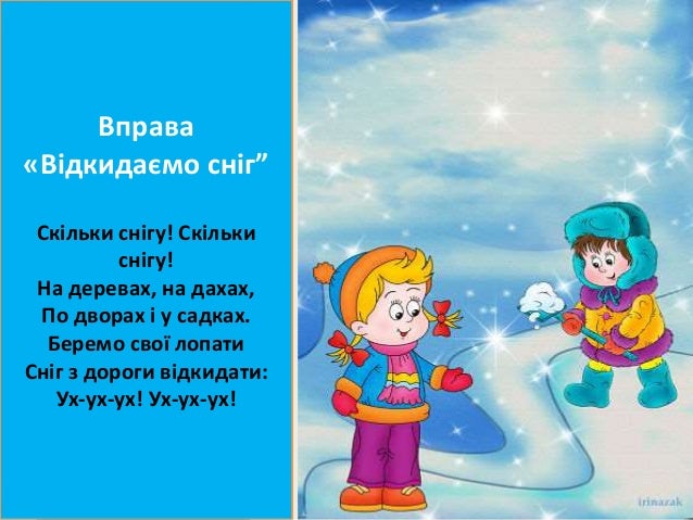 24. 24. Запитала Сніговія:- Нащо снігу нам навіяв? А він каже: -Шу-шу-шу! Я ще більше натрушу! (В.Кленц). Вдих через ніс-затримка дихання-видих через рот із вимовлянням: “Шу-шу-шу!...”