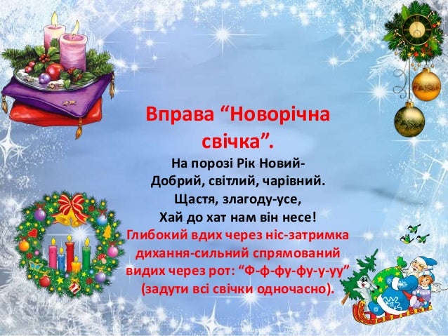 35. 35. Вправа “Новорічна свічка”. На порозі Рік Новий- Добрий, світлий, чарівний. Щастя, злагоду-усе, Хай до хат нам він несе! Глибокий вдих через ніс-затримка дихання-сильний спрямований видих через рот: “Ф-ф-фу-фу-у-уу” (задути всі свічки одночасно).