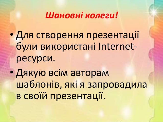 36. 36. Шановні колеги! • Для створення презентації були використані Internet- ресурси. • Дякую всім авторам шаблонів, які я запровадила в своїй презентації.