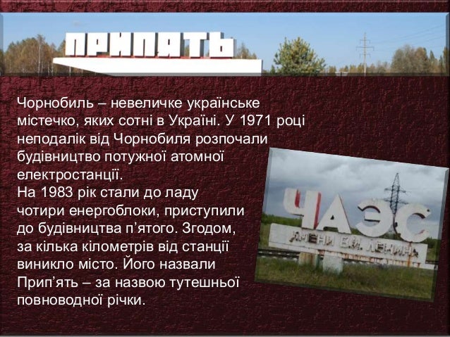 2. 2. Чорнобиль – невеличке українське містечко, яких сотні в Україні. У 1971 році неподалік від Чорнобиля розпочали будівництво потужної атомної електростанції. На 1983 рік стали до ладу чотири енергоблоки, приступили до будівництва п’ятого. Згодом, за кілька кілометрів від станції виникло місто. Його назвали Прип’ять – за назвою тутешньої повноводної річки.
