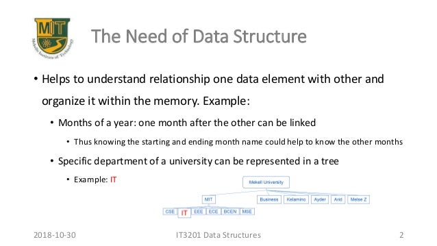 2. 2. The Need of Data Structure • Helps to understand relationship one data element with other and organize it within the memory. Example: • Months of a year: one month after the other can be linked • Thus knowing the starting and ending month name could help to know the other months • Specific department of a university can be represented in a tree • Example: IT IT3201 Data Structures 22018-10-30