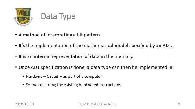 9. 9. Data Type • A method of interpreting a bit pattern. • It’s the implementation of the mathematical model specified by an ADT. • It is an internal representation of data in the memory. • Once ADT specification is done, a data type can then be implemented in: • Hardwire – Circuitry as part of a computer • Software – using the existing hard wired instructions IT3201 Data Structures 92018-10-30