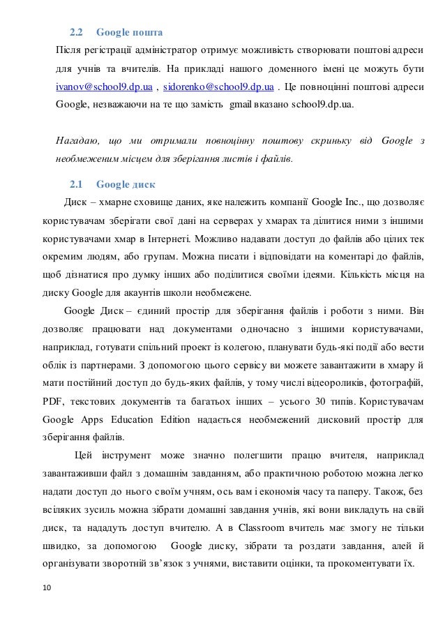 10. 10. 10 2.2 Google пошта Після регістрації адміністратор отримує можливість створювати поштові адреси для учнів та вчителів. На прикладі нашого доменного імені це можуть бути ivanov@school9.dp.ua , sidorenko@school9.dp.ua . Це повноцінні поштові адреси Google, незважаючи на те що замість gmail вказано school9.dp.ua. Нагадаю, що ми отримали повноцінну поштову скриньку від Google з необмеженим місцем для зберігання листів і файлів. 2.1 Google диск Диск – хмарне сховище даних, яке належить компанії Google Inc., що дозволяє користувачам зберігати свої дані на серверах у хмарах та ділитися ними з іншими користувачами хмар в Інтернеті. Можливо надавати доступ до файлів або цілих тек окремим людям, або групам. Можна писати і відповідати на коментарі до файлів, щоб дізнатися про думку інших або поділитися своїми ідеями. Кількість місця на диску Google для акаунтів школи необмежене. Google Диск – єдиний простір для зберігання файлів і роботи з ними. Він дозволяє працювати над документами одночасно з іншими користувачами, наприклад, готувати спільний проект із колегою, планувати будь-які події або вести облік із партнерами. З допомогою цього сервісу ви можете завантажити в хмару й мати постійний доступ до будь-яких файлів, у тому числі відеороликів, фотографій, PDF, текстових документів та багатьох інших – усього 30 типів. Користувачам Google Apps Education Edition надається необмежений дисковий простір для зберігання файлів. Цей інструмент може значно полегшити працю вчителя, наприклад завантаживши файл з домашнім завданням, або практичною роботою можна легко надати доступ до нього своїм учням, ось вам і економія часу та паперу. Також, без всіляких зусиль можна зібрати домашні завдання учнів, які вони викладуть на свій диск, та нададуть доступ вчителю. А в Classroom вчитель має змогу не тільки швидко, за допомогою Google диску, зібрати та роздати завдання, алей й організувати зворотній зв’язок з учнями, виставити оцінки, та прокоментувати їх.