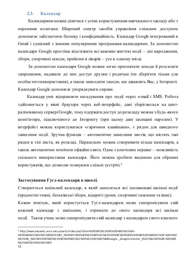 11. 11. 11 2.3. Календар Календарямиможна ділитися з усіма користувачаминавчального закладу або з окремими колегами. Широкий спектр засобів управління спільним доступом допомагає забезпечити безпеку і конфіденційність. Календар Google інтегрований в Gmail і сумісний з іншими популярними програмами-календарями. За допомогою календаря Google простіше відстежити всі важливі життєві події – дні народження, збори, спортивні заходи, прийоми в лікарів – усе в одному місці. За допомогою календаря Google можна легко призначати заходи й розсилати запрошення, надавати до них доступ друзям і родичам (чи зберігати тільки для особистоговикористання), а також знаходити заходи, що цікавлять Вас, у Інтернеті. Календар Google допомагає упорядкувати справи. Календар уміє відправляти нагадування про події через e-mail і SMS. Робота здійснюється у вікні браузера через веб-інтерфейс, дані зберігаються на цент- ралізованому сервері Google, тому одержатидоступ до розкладу можна з будь-якого комп'ютера, підключеного до Інтернету (при цьому дані захищені паролем). У інтерфейсі можна користуватися «гарячими клавішами», є рядок для швидкого занесення події. Зручна функція – автоматичне занесення листів, що містять такі рядки в тілі листа, як розклад. Паралельно можна створювати кілька календарів, а також автоматично помічати офіційні свята. Одна з ключових переваг – можливість спільного використання календаря. Його можна зробити видимим для обраних користувачів, що дозволяє планувати спільні зустрічі.3 Застосування Гугл-календаря в школі. Створюється шкільний календар, в який заносяться всі заплановані шкільні події (предметні тижні, батьківські збори, відкриті уроки, спортивні змагання та інше). Кожен вчитель, який користується Гугл-календарем може синхронізувати свій власний календар з шкільним, і отримати до свого календаря всі шкільні події. Також учень може синхронізувати свій календар з календарем свого класного 3 http://www.eduwiki.uran.net.ua/wiki/index.php?title=%D0%9C%D1%96%D0%BD%D1%96- %D0%BA%D1%83%D1%80%D1%81_%D0%9F%D0%B5%D1%80%D1%81%D0%BE%D0%BD%D0%B0%D0%BB%D1%8C%D0%BD %D1%96_%D1%81%D0%B5%D1%80%D0%B2%D1%96%D1%81%D0%B8Google._GoogleCalendar_(%D1%82%D0%B5%D0%BE %D1%80%D1%96%D1%8F)