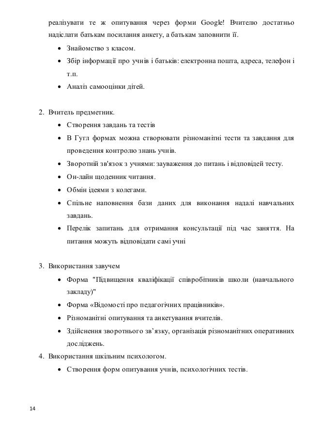 13. 13. 13 навчального матеріалу. За допомогою одного з сервісів Google+ можна швидко й легко ділитися улюбленими відеороликами на YouTube. Для цього потрібно натиснути значок Google+ у розділі "Надіслати" під відео. І всі ваші колеги та учні, які є у ваших колах побачать це відео. Наша школа має свій канал на цьому сервісі, там розміщенно шкільне відео з різних заходів, свят. Також на шкільному каналі викладено відео-роботи учнів. 2.8 Форма Google Форма Google - відмінний помічник вчителя. За допомогою форми можна проводити різні опитування, вікторини, створювати анкети, тести. При створенні форми автоматично створюється таблиця Google, в якій накопичуються результати заповнення форми. Таблиця надає зручні можливості зберігання і обробки зібраних даних. Ось деякі приклади використання форми Google в освіті:  реєстрація учасників навчальних проектів;  проміжний контроль, вікторина, опитування, анкети  організація спільної роботи групи, самооцінка,  рефлексія.4 За допомогою форм Гугл можно організувати опитування, тестування учнів, анкетування вчителів. Створити Гугл форму доволі не важко, кожен користувач, який має початкові навички роботи з офісними додатками легко впорається з цією задачею. При проведені тестування можливо автоматично оцінити роботи учнів та надіслати їм на електронні адреси оцінки. Приклади використання вчителями форм Гугл: 1. Класний керівник. Анкетування учнів та їх батьків При проведені анкетування батьків класний керівник передає паперові анкети з учнями, чекає їх повернення, а потім обробляє вручну. Процес обробки даних досить трудомісткий, багато з анкет не повертаються. Але ж можливо 4 http://vasschoolinf.blogspot.ru/p/blog-page_9.html