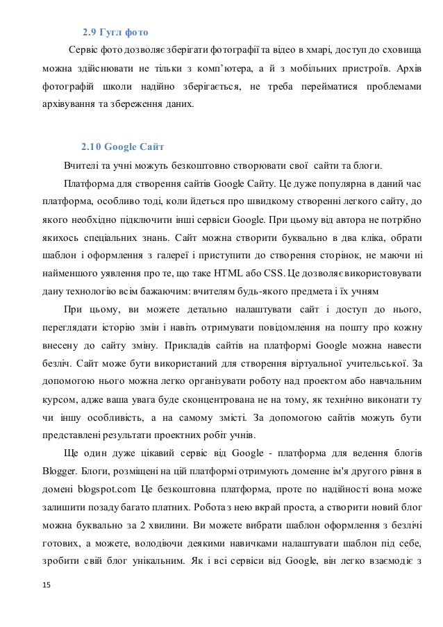 15. 15. 15 2.9 Гугл фото Сервіс фото дозволяєзберігати фотографії та відео в хмарі, доступдо сховища можна здійснювати не тільки з комп’ютера, а й з мобільних пристроїв. Архів фотографій школи надійно зберігається, не треба перейматися проблемами архівування та збереження даних. 2.10 Google Сайт Вчителі та учні можуть безкоштовно створювати свої сайти та блоги. Платформа для створення сайтів Google Сайту. Це дуже популярна в даний час платформа, особливо тоді, коли йдеться про швидкому створенні легкого сайту, до якого необхідно підключити інші сервіси Google. При цьому від автора не потрібно якихось спеціальних знань. Сайт можна створити буквально в два кліка, обрати шаблон і оформлення з галереї і приступити до створення сторінок, не маючи ні найменшого уявлення про те, що таке HTML або CSS. Це дозволяє використовувати дану технологію всім бажаючим: вчителям будь-якого предмета і їх учням При цьому, ви можете детально налаштувати сайт і доступ до нього, переглядати історію змін і навіть отримувати повідомлення на пошту про кожну внесену до сайту зміну. Прикладів сайтів на платформі Googlе можна навести безліч. Сайт може бути використаний для створення віртуальної учительської. За допомогою нього можна легко організувати роботу над проектом або навчальним курсом, адже ваша увага буде сконцентрована не на тому, як технічно виконати ту чи іншу особливість, а на самому змісті. За допомогою сайтів можуть бути представлені результати проектних робіт учнів. Ще один дуже цікавий сервіс від Google - платформа для ведення блогів Blogger. Блоги, розміщені на цій платформі отримують доменне ім'я другого рівня в домені blogspot.com Це безкоштовна платформа, проте по надійності вона може залишити позаду багато платних. Роботаз нею вкрай проста, а створити новий блог можна буквально за 2 хвилини. Ви можете вибрати шаблон оформлення з безлічі готових, а можете, володіючи деякими навичками налаштувати шаблон під себе, зробити свій блог унікальним. Як і всі сервіси від Google, він легко взаємодіє з
