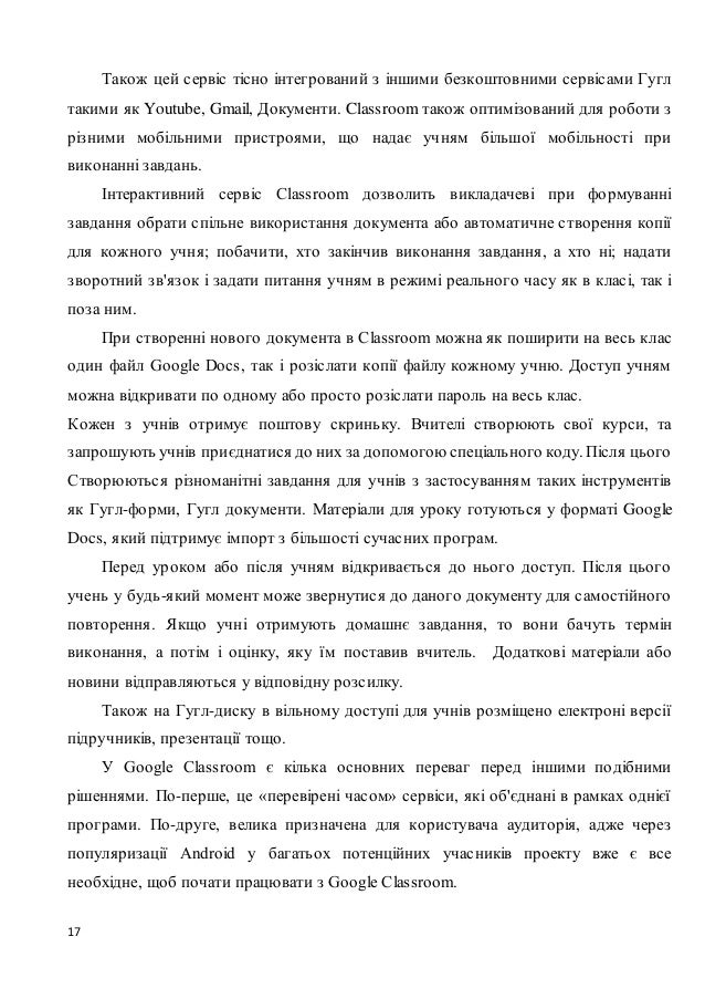 17. 17. 17 Також цей сервіс тісно інтегрований з іншими безкоштовними сервісами Гугл такими як Youtube, Gmail, Документи. Classroom також оптимізований для роботи з різними мобільними пристроями, що надає учням більшої мобільності при виконанні завдань. Інтерактивний сервіс Classroom дозволить викладачеві при формуванні завдання обрати спільне використання документа або автоматичне створення копії для кожного учня; побачити, хто закінчив виконання завдання, а хто ні; надати зворотний зв'язок і задати питання учням в режимі реального часу як в класі, так і поза ним. При створенні нового документа в Classroom можна як поширити на весь клас один файл Google Docs, так і розіслати копії файлу кожному учню. Доступ учням можна відкривати по одному або просто розіслати пароль на весь клас. Кожен з учнів отримує поштову скриньку. Вчителі створюють свої курси, та запрошують учнів приєднатися до них за допомогою спеціального коду. Після цього Створюються різноманітні завдання для учнів з застосуванням таких інструментів як Гугл-форми, Гугл документи. Матеріали для уроку готуються у форматі Google Docs, який підтримує імпорт з більшості сучасних програм. Перед уроком або після учням відкривається до нього доступ. Після цього учень у будь-який момент може звернутися до даного документу для самостійного повторення. Якщо учні отримують домашнє завдання, то вони бачуть термін виконання, а потім і оцінку, яку їм поставив вчитель. Додаткові матеріали або новини відправляються у відповідну розсилку. Також на Гугл-диску в вільному доступі для учнів розміщено електроні версії підручників, презентації тощо. У Google Classroom є кілька основних переваг перед іншими подібними рішеннями. По-перше, це «перевірені часом» сервіси, які об'єднані в рамках однієї програми. По-друге, велика призначена для користувача аудиторія, адже через популяризації Android у багатьох потенційних учасників проекту вже є все необхідне, щоб почати працювати з Google Classroom.