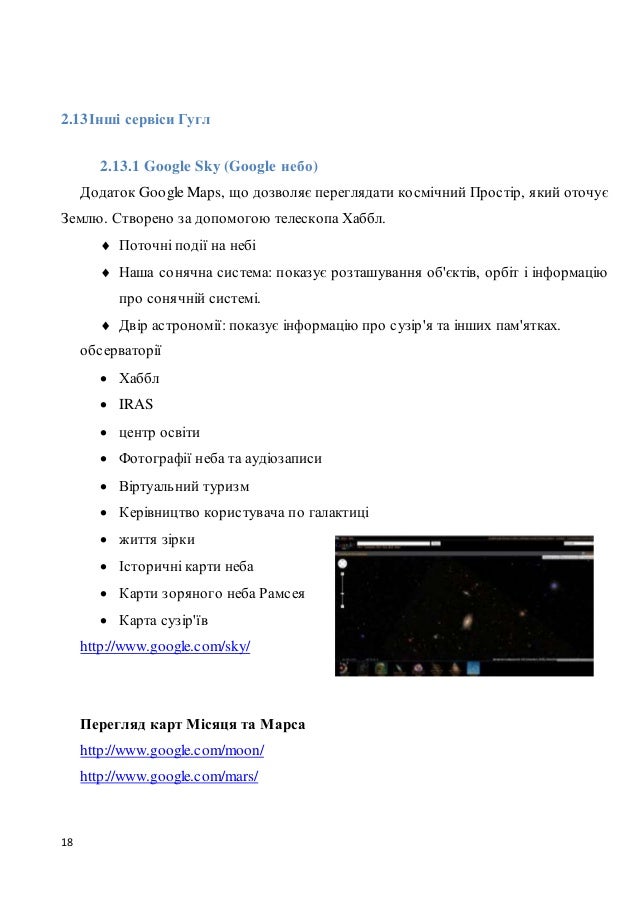 18. 18. 18 2.13Інші сервіси Гугл 2.13.1 Google Sky (Google небо) Додаток Google Maps, що дозволяє переглядати космічний Простір, який оточує Землю. Створено за допомогою телескопа Хаббл.  Поточні події на небі  Наша сонячна система: показує розташування об'єктів, орбіт і інформацію про сонячній системі.  Двір астрономії: показує інформацію про сузір'я та інших пам'ятках. обсерваторії  Хаббл  IRAS  центр освіти  Фотографії неба та аудіозаписи  Віртуальний туризм  Керівництво користувача по галактиці  життя зірки  Історичні карти неба  Карти зоряного неба Рамсея  Карта сузір'їв http://www.google.com/sky/ Перегляд карт Місяця та Марса http://www.google.com/moon/ http://www.google.com/mars/