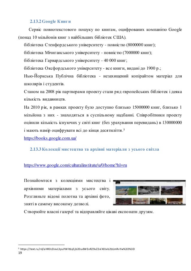 19. 19. 19 2.13.2Google Книги Сервіс повнотекстового пошуку по книгам, оцифрованих компанією Google (понад 10 мільйонів книг з найбільших бібліотек США). бібліотека Стенфордського університету - повністю (8000000 книг); бібліотека Мічиганського університету - повністю (7000000 книг); бібліотека Гарвардського університету - 40 000 книг; бібліотека Оксфордського університету - все книги, видані до 1900 р.; Нью-Йоркська Публічна бібліотека - незахищений копірайтом матеріал для школярів і студентів. Станом на 2008 рік партнерами проекту стали ряд європейських бібліотек і деяка кількість видавництв. На 2010 рік, в рамках проекту було доступно близько 15000000 книг, близько 1 мільйона з них - знаходяться в суспільному надбанні. Співробітники проекту оцінили кількість існуючих у світі книг (без урахування перевидань) в 130000000 і мають намір оцифрувати всі до кінця десятиліття.5 https://books.google.com.ua/ 2.13.3Колекції мистецтва та архівні матеріали з усього світла https://www.google.com/culturalinstitute/u/0/home?hl=ru Познайомтеся з колекціями мистецтва і архівними матеріалами з усього світу. Розгляньте відомі полотна та архівні фото, зняті в самому високому дозволі. Створюйте власні галереї та відправляйте цікаві експонати друзям. 5 https://text.ru/rd/aHR0cDovL3puYWltby5jb20udWEvR29vZ2xlX0Jvb2tzLmRvYw%3D%3D