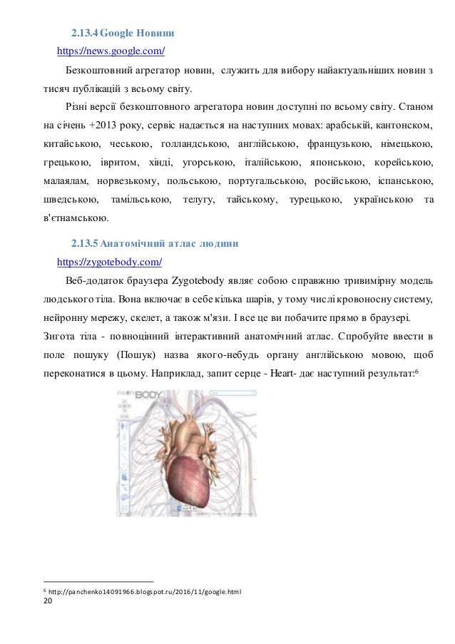 20. 20. 20 2.13.4Google Новини https://news.google.com/ Безкоштовний агрегатор новин, служить для вибору найактуальніших новин з тисяч публікацій з всьому світу. Різні версії безкоштовного агрегатора новин доступні по всьому світу. Станом на січень +2013 року, сервіс надається на наступних мовах: арабській, кантонском, китайською, чеською, голландською, англійською, французькою, німецькою, грецькою, івритом, хінді, угорською, італійською, японською, корейською, малаялам, норвезькому, польською, португальською, російською, іспанською, шведською, тамільською, телугу, тайському, турецькою, українською та в'єтнамською. 2.13.5Анатомічний атлас людини https://zygotebody.com/ Веб-додаток браузера Zygotebody являє собою справжню тривимірну модель людського тіла. Вона включає в себе кілька шарів, у тому числікровоноснусистему, нейронну мережу, скелет, а також м'язи. І все це ви побачите прямо в браузері. Зигота тіла - повноцінний інтерактивний анатомічний атлас. Спробуйте ввести в поле пошуку (Пошук) назва якого-небудь органу англійською мовою, щоб переконатися в цьому. Наприклад, запит серце - Heart- дає наступний результат:6 6 http://panchenko14091966.blogspot.ru/2016/11/google.html