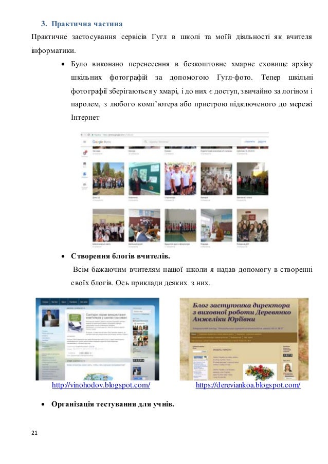 21. 21. 21 3. Практична частина Практичне застосування сервісів Гугл в школі та моїй діяльності як вчителя інформатики.  Було виконано перенесення в безкоштовне хмарне сховище архіву шкільних фотографій за допомогою Гугл-фото. Тепер шкільні фотографії зберігаються у хмарі, і до них є доступ, звичайно за логіном і паролем, з любого комп’ютера або пристрою підключеного до мережі Інтернет  Створення блогів вчителів. Всім бажаючим вчителям нашої школи я надав допомогу в створенні своїх блогів. Ось приклади деяких з них. http://vinohodov.blogspot.com/ https://dereviankoa.blogspot.com/  Організація тестування для учнів.
