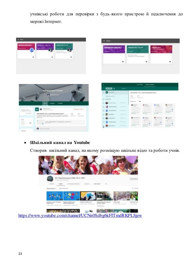 23. 23. 23 учнівські роботи для перевірки з будь-якого пристрою й підключення до мережі Інтернет.  Шкільний канал на Youtube Створив шкільний канал, на якому розміщую шкільне відео та роботи учнів. https://www.youtube.com/channel/UCNn0Sdbg6kFITmdRKPLSjew