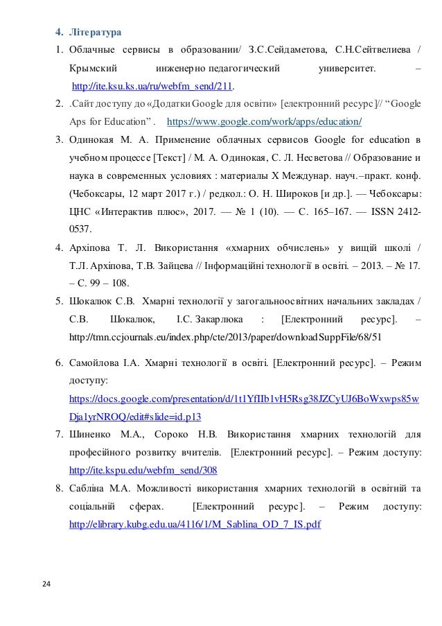 24. 24. 24 4. Література 1. Облачные сервисы в образовании/ З.С.Сейдаметова, С.Н.Сейтвелиева / Крымский инженерно педагогический университет. – http://ite.ksu.ks.ua/ru/webfm_send/211. 2. .Сайт доступу до «ДодаткиGoogle для освіти» [електронний ресурс]// “Google Aps for Education” . https://www.google.com/work/apps/education/ 3. Одинокая М. А. Применение облачных сервисов Google for education в учебном процессе [Текст] / М. А. Одинокая, С. Л. Несветова // Образование и наука в современных условиях : материалы X Междунар. науч.–практ. конф. (Чебоксары, 12 март 2017 г.) / редкол.: О. Н. Широков [и др.]. — Чебоксары: ЦНС «Интерактив плюс», 2017. — № 1 (10). — С. 165–167. — ISSN 2412- 0537. 4. Архіпова Т. Л. Використання «хмарних обчислень» у вищій школі / Т.Л. Архіпова, Т.В. Зайцева // Інформаційні технології в освіті. – 2013. – № 17. – С. 99 – 108. 5. Шокалюк С.В. Хмарні технології у загогальноосвітних начальних закладах / С.В. Шокалюк, І.С. Закарлюка : [Електронний ресурс]. – http://tmn.ccjournals.eu/index.php/cte/2013/paper/downloadSuppFile/68/51 6. Самойлова І.А. Хмарні технології в освіті. [Електронний ресурс]. – Режим доступу: https://docs.google.com/presentation/d/1t1YfIIb1vH5Rsg38JZCyUJ6BoWxwps85w Dja1yrNROQ/edit#slide=id.p13 7. Шиненко М.А., Сороко Н.В. Використання хмарних технологій для професійного розвитку вчителів. [Електронний ресурс]. – Режим доступу: http://ite.kspu.edu/webfm_send/308 8. Сабліна М.А. Можливості використання хмарних технологій в освітній та соціальній сферах. [Електронний ресурс]. – Режим доступу: http://elibrary.kubg.edu.ua/4116/1/M_Sablina_OD_7_IS.pdf