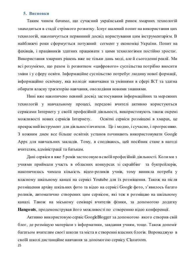 25. 25. 25 5. Висновки Таким чином бачимо, що сучасний український ринок хмарних технологій знаходиться в стадії стрімкого розвитку. Існує шалений попит на використання цих технологій, накопичується первинний досвід користування цим інструментарієм. В найближчі роки сформується потужний сегмент у економіці України. Попит на фахівців, і працівників здатних працювати з цими технологіями постійно зростає. Використання хмарних рішень вже не тільки дань моді, але й сьогоденні реалії. Ми всі розуміємо, що разом із розвитком «цифрового» суспільства потрібно вносити зміни і у сферу освіти. Інформаційне суспільство потребує людину нової формації, інформаційно освічену, яка володіє навичками та уміннями в сфері ІКТ та здатна обирати власну траєкторію навчання, оволодіння новими знаннями. Нині вже накопичено певний досвід застосування інформаційних та мережних технологій у навчальному процесі, передові вчителі активно користуються сервісами Інтернету у своїй професійній діяльності, використовують також окремі можливості нових сервісів Інтернету. Освітні сервіси розміщені в хмарах, це прекраснийінструмент для діяльностівчителя. Це і модно, і сучасно, і прогресивно. З кожним днем все більше освітніх установ починають використовувати Google Apps для навчальних закладів. Тому, я сподіваюсь, цей посібник стане в нагоді вчителям, адміністрації та батькам. Дані сервіси я вже 5 років застосовую в своїйпрофесійній діяльності. Колими з учнями приймали участь в обласних конкурсах зі скрайбінг та буктрейлерів, накопичилась чимала кількість відео-роликів учнів, тому виникла потреба у власному шкільному каналі на сервісі Youtube для їх розміщення. Також на після розміщення архіву шкільних фото та відео на сервісі Google фото, з’явилось багато роликів, автоматично створених цим сервісом, які теж я розміщаю на шкільному каналі. Також на міському семінарі вчителів фізики, за допомогою додатку Hangouts, продемонстрував його можливості по створенню відео конференції. Активно використовуюсервіс GoogleBlogger за допомогою якого створив свій блог, де розміщую матеріали з інформатики, завдання учням, тощо. Також допоміг багатьом вчителям своєї школи та міста в створенні власних блогів. Впроваджую в своїй школі дистанційне навчання за допомогою сервісу Classroom.