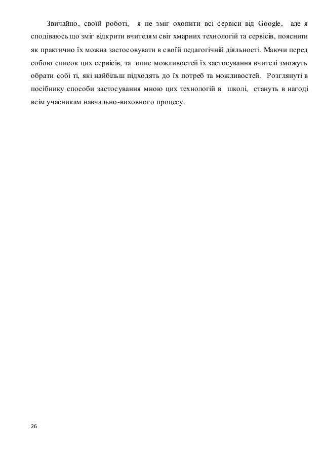 26. 26. 26 Звичайно, своїй роботі, я не зміг охопити всі сервіси від Google, але я сподіваюсь що зміг відкрити вчителям світ хмарних технологій та сервісів, пояснити як практично їх можна застосовувати в своїй педагогічній діяльності. Маючи перед собою список цих сервісів, та опис можливостей їх застосування вчителі зможуть обрати собі ті, які найбільш підходять до їх потреб та можливостей. Розглянуті в посібнику способи застосування мною цих технологій в школі, стануть в нагоді всім учасникам навчально-виховного процесу.