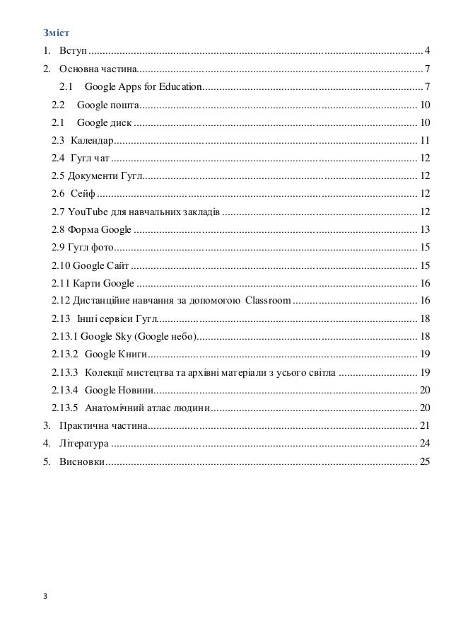 3. 3. 3 Зміст 1. Вступ......................................................................................................................4 2. Основна частина.....................................................................................................7 2.1 Google Apps for Education..............................................................................7 2.2 Google пошта.................................................................................................. 10 2.1 Google диск .................................................................................................... 10 2.3 Календар........................................................................................................... 11 2.4 Гугл чат............................................................................................................ 12 2.5 Документи Гугл................................................................................................. 12 2.6 Сейф ................................................................................................................. 12 2.7 YouTube для навчальних закладів..................................................................... 12 2.8 Форма Google .................................................................................................... 13 2.9 Гугл фото........................................................................................................... 15 2.10 Google Сайт ..................................................................................................... 15 2.11 Карти Google ................................................................................................... 16 2.12 Дистанційне навчання за допомогою Classroom ............................................ 16 2.13 Інші сервіси Гугл............................................................................................ 18 2.13.1 Google Sky (Google небо).............................................................................. 18 2.13.2 Google Книги............................................................................................... 19 2.13.3 Колекції мистецтва та архівні матеріали з усього світла ............................ 19 2.13.4 Google Новини............................................................................................. 20 2.13.5 Анатомічний атлас людини......................................................................... 20 3. Практична частина............................................................................................... 21 4. Література ............................................................................................................ 24 5. Висновки.............................................................................................................. 25