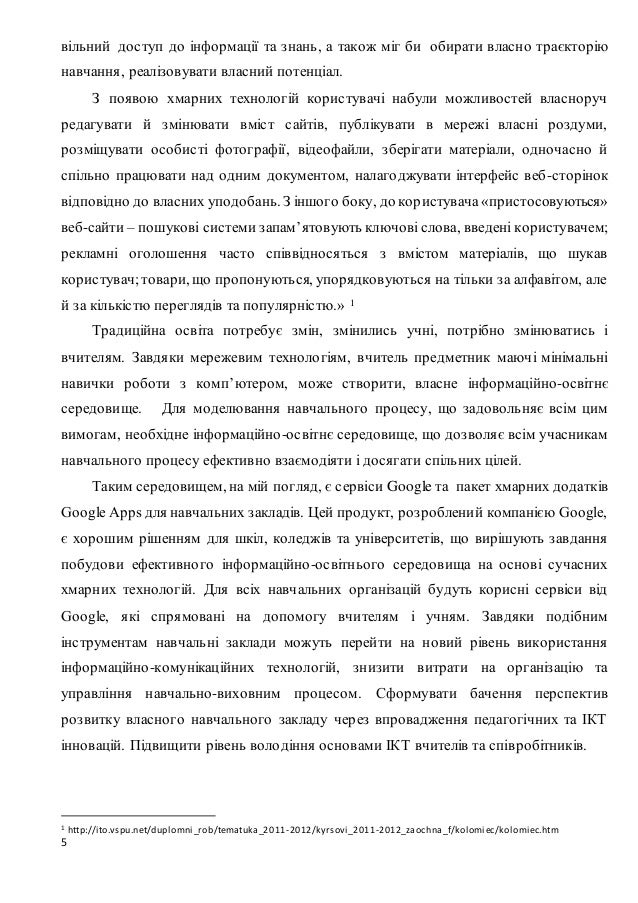 5. 5. 5 вільний доступ до інформації та знань, а також міг би обирати власно траєкторію навчання, реалізовувати власний потенціал. З появою хмарних технологій користувачі набули можливостей власноруч редагувати й змінювати вміст сайтів, публікувати в мережі власні роздуми, розміщувати особисті фотографії, відеофайли, зберігати матеріали, одночасно й спільно працювати над одним документом, налагоджувати інтерфейс веб-сторінок відповідно до власних уподобань. З іншого боку, до користувача«пристосовуються» веб-сайти – пошукові системи запам’ятовують ключовіслова, введені користувачем; рекламні оголошення часто співвідносяться з вмістом матеріалів, що шукав користувач;товари, що пропонуються, упорядковуються на тільки за алфавітом, але й за кількістю переглядів та популярністю.» 1 Традиційна освіта потребує змін, змінились учні, потрібно змінюватись і вчителям. Завдяки мережевим технологіям, вчитель предметник маючі мінімальні навички роботи з комп’ютером, може створити, власне інформаційно-освітнє середовище. Для моделювання навчального процесу, що задовольняє всім цим вимогам, необхідне інформаційно-освітнє середовище, що дозволяє всім учасникам навчального процесу ефективно взаємодіяти і досягати спільних цілей. Таким середовищем, на мій погляд, є сервіси Google та пакет хмарних додатків Google Apps для навчальних закладів. Цей продукт, розроблений компанією Google, є хорошим рішенням для шкіл, коледжів та університетів, що вирішують завдання побудови ефективного інформаційно-освітнього середовища на основі сучасних хмарних технологій. Для всіх навчальних організацій будуть корисні сервіси від Google, які спрямовані на допомогу вчителям і учням. Завдяки подібним інструментам навчальні заклади можуть перейти на новий рівень використання інформаційно-комунікаційних технологій, знизити витрати на організацію та управління навчально-виховним процесом. Сформувати бачення перспектив розвитку власного навчального закладу через впровадження педагогічних та ІКТ інновацій. Підвищити рівень володіння основами ІКТ вчителів та співробітників. 1 http://ito.vspu.net/duplomni_rob/tematuka_2011-2012/kyrsovi_2011-2012_zaochna_f/kolomiec/kolomiec.htm