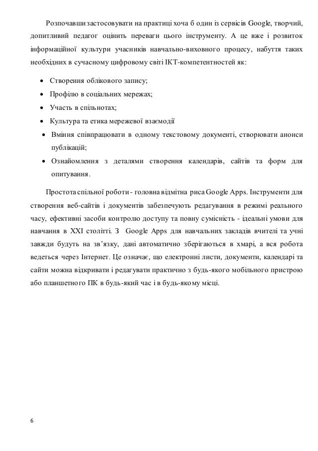6. 6. 6 Розпочавшизастосовувати на практиці хоча б один із сервісів Google, творчий, допитливий педагог оцінить переваги цього інструменту. А це вже і розвиток інформаційної культури учасників навчально-виховного процесу, набуття таких необхідних в сучасному цифровому світі ІКТ-компетентностей як:  Створення облікового запису;  Профілю в соціальних мережах;  Участь в спільнотах;  Культура та етика мережевої взаємодії  Вміння співпрацювати в одному текстовому документі, створювати анонси публікацій;  Ознайомлення з деталями створення календарів, сайтів та форм для опитування. Простотаспільної роботи - головнавідмітна рисаGoogle Apps. Інструменти для створення веб-сайтів і документів забезпечують редагування в режимі реального часу, ефективні засоби контролю доступу та повну сумісність - ідеальні умови для навчання в XXI столітті. З Google Apps для навчальних закладів вчителі та учні завжди будуть на зв’язку, дані автоматично зберігаються в хмарі, а вся робота ведеться через Інтернет. Це означає, що електронні листи, документи, календарі та сайти можна відкривати і редагувати практично з будь-якого мобільного пристрою або планшетного ПК в будь-який час і в будь-якому місці.