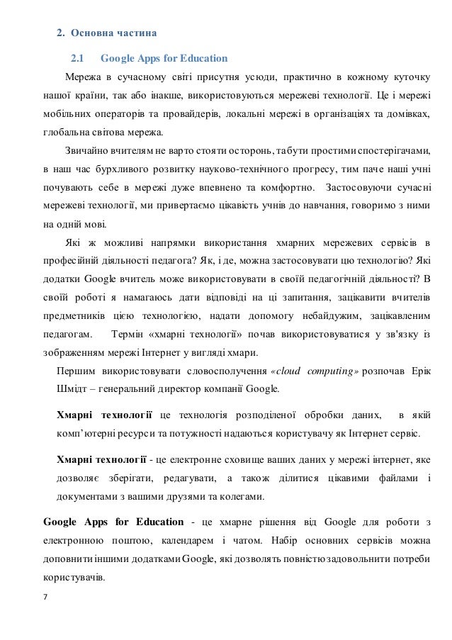7. 7. 7 2. Основна частина 2.1 Google Apps for Education Мережа в сучасному світі присутня усюди, практично в кожному куточку нашої країни, так або інакше, використовуються мережеві технології. Це і мережі мобільних операторів та провайдерів, локальні мережі в організаціях та домівках, глобальна світова мережа. Звичайно вчителям не варто стояти осторонь, табути простимиспостерігачами, в наш час бурхливого розвитку науково-технічного прогресу, тим паче наші учні почувають себе в мережі дуже впевнено та комфортно. Застосовуючи сучасні мережеві технології, ми привертаємо цікавість учнів до навчання, говоримо з ними на одній мові. Які ж можливі напрямки використання хмарних мережевих сервісів в професійній діяльності педагога? Як, і де, можна застосовувати цю технологію? Які додатки Google вчитель може використовувати в своїй педагогічній діяльності? В своїй роботі я намагаюсь дати відповіді на ці запитання, зацікавити вчителів предметників цією технологією, надати допомогу небайдужим, зацікавленим педагогам. Термін «хмарні технології» почав використовуватися у зв'язку із зображенням мережі Інтернет у вигляді хмари. Першим використовувати словосполучення «cloud computing» розпочав Ерік Шмідт – генеральний директор компанії Google. Хмарні технології це технологія розподіленої обробки даних, в якій комп’ютерні ресурси та потужності надаються користувачу як Інтернет сервіс. Хмарні технології - це електронне сховище ваших даних у мережі інтернет, яке дозволяє зберігати, редагувати, а також ділитися цікавими файлами і документами з вашими друзями та колегами. Google Apps for Education - це хмарне рішення від Google для роботи з електронною поштою, календарем і чатом. Набір основних сервісів можна доповнитиіншими додатками Google, які дозволять повністю задовольнити потреби користувачів.