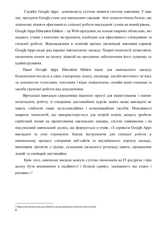 8. 8. 8 Служби Google Apps допоможуть суттєво змінити систему навчання. У наш час, продукти Google стали для навчальних закладів тією технологічною базою, що допоможе підняти ефективність спільної роботи викладачів і учнів на новий рівень. Google Apps Education Edition – це Web-програми, на основі хмарних обчислень, які надають учням і вчителям інструменти, необхідні для ефективного спілкування та спільної роботи. Впровадження в освітній процес організації навчання сервісів Google Apps надає ряд переваг навчальному закладу. Хмарні технології дозволяють економити кошти на оплату ліцензій на програмне забезпечення його супровід та адміністрування. Пакет Google Apps Education Edition надає для навчального закладу безкоштовніпослуги, а саме: електронну пошту, календар, засобимиттєвого зв’язку за допомогою голосових, текстових і відео повідомлень, онлайн відео-сховище та засоби групової роботи над документами. Віртуальні навчальні середовища відносно прості для користування і значно полегшують роботу зі створення дистанційних курсів, навіть якщо викладачі не мають глибоких знань мультимедійних і комунікаційних засобів. Можливості хмарних технологій, що використовується для потреб освіти, можуть зробити серйозний вплив на проектування навчальних завдань, систем оцінювання і на підсумковий навчальний досвід, що формується в учнів. «З сервісом Google Apps викладачі та учні отримують більше інструментів для спільної роботи в навчальному процесі: створення веб-сайтів та внутрішнього порталу закладу, виконання проектів у групах, складання загального розкладу занять, проведення лекцій та семінарів дистанційно. Крім того, навчальні заклади можуть суттєво економити на ІТ-ресурсах і при цьому бути впевненими в надійності і безпеці сервісу, захищеного від спаму і реклами.»2 2 https://profosvita.od.ua/a194641-vprovadzhennya-hmarnih-servsv.html
