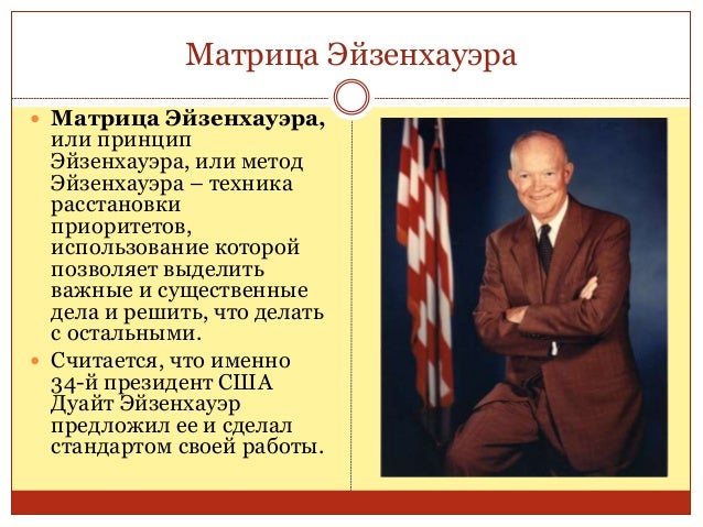 11. 11. Матрица Эйзенхауэра  Матрица Эйзенхауэра, или принцип Эйзенхауэра, или метод Эйзенхауэра – техника расстановки приоритетов, использование которой позволяет выделить важные и существенные дела и решить, что делать с остальными.  Считается, что именно 34-й президент США Дуайт Эйзенхауэр предложил ее и сделал стандартом своей работы.