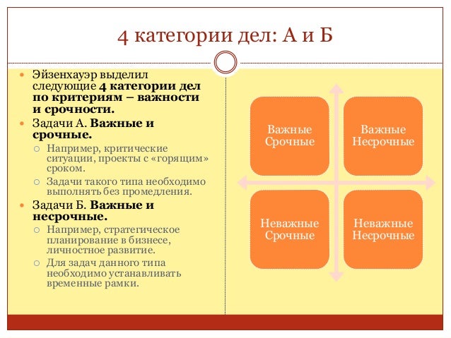 12. 12. 4 категории дел: А и Б  Эйзенхауэр выделил следующие 4 категории дел по критериям – важности и срочности.  Задачи А. Важные и срочные.  Например, критические ситуации, проекты с «горящим» сроком.  Задачи такого типа необходимо выполнять без промедления.  Задачи Б. Важные и несрочные.  Например, стратегическое планирование в бизнесе, личностное развитие.  Для задач данного типа необходимо устанавливать временные рамки. Важные Срочные Важные Несрочные Неважные Срочные Неважные Несрочные