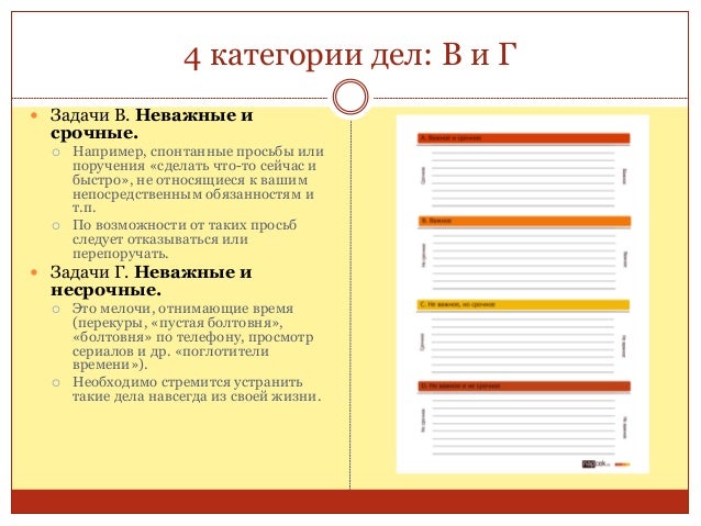 13. 13. 4 категории дел: В и Г  Задачи В. Неважные и срочные.  Например, спонтанные просьбы или поручения «сделать что-то сейчас и быстро», не относящиеся к вашим непосредственным обязанностям и т.п.  По возможности от таких просьб следует отказываться или перепоручать.  Задачи Г. Неважные и несрочные.  Это мелочи, отнимающие время (перекуры, «пустая болтовня», «болтовня» по телефону, просмотр сериалов и др. «поглотители времени»).  Необходимо стремится устранить такие дела навсегда из своей жизни.