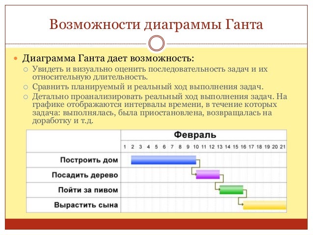 15. 15. Описание диаграммы Ганта  Диаграмма Ганта – это один из наиболее удобных и популярных способов графического представления времени выполнения задач.  Каждая линия в диаграмме представляет один процесс, наложенный на шкалу времени. Задачи и подзадачи, составляющие план, размещаются по вертикали, по горизонтали задается временная шкала. Начало, конец и длина отрезка на шкале времени соответствуют началу, концу и длительности задачи.  На некоторых диаграммах Ганта также показывается зависимость между задачами. Диаграмма может использоваться для представления текущего состояния выполнения работ: часть прямоугольника, отвечающего задаче, заштриховывается, отмечая процент выполнения задачи; показывается вертикальная линия, отвечающая моменту «сегодня».  Часто диаграмма Ганта соседствует с таблицей со списком работ, строки которой соответствуют отдельно взятой задаче, отображенной на диаграмме, а столбцы содержат дополнительную информацию о задаче.