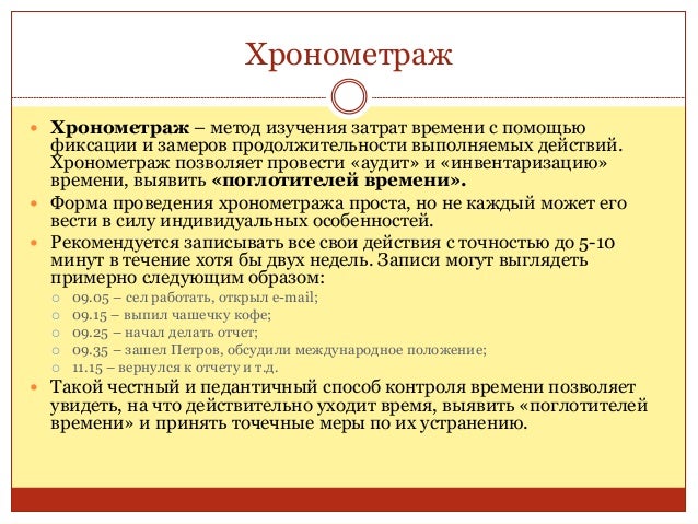 17. 17. Хронометраж  Хронометраж – метод изучения затрат времени с помощью фиксации и замеров продолжительности выполняемых действий. Хронометраж позволяет провести «аудит» и «инвентаризацию» времени, выявить «поглотителей времени».  Форма проведения хронометража проста, но не каждый может его вести в силу индивидуальных особенностей.  Рекомендуется записывать все свои действия с точностью до 5-10 минут в течение хотя бы двух недель. Записи могут выглядеть примерно следующим образом:  09.05 – сел работать, открыл e-mail;  09.15 – выпил чашечку кофе;  09.25 – начал делать отчет;  09.35 – зашел Петров, обсудили международное положение;  11.15 – вернулся к отчету и т.д.  Такой честный и педантичный способ контроля времени позволяет увидеть, на что действительно уходит время, выявить «поглотителей времени» и принять точечные меры по их устранению.