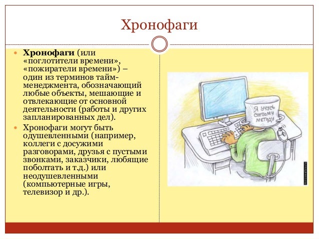 18. 18. Хронофаги  Хронофаги (или «поглотители времени», «пожиратели времени») – один из терминов тайм- менеджмента, обозначающий любые объекты, мешающие и отвлекающие от основной деятельности (работы и других запланированных дел).  Хронофаги могут быть одушевленными (например, коллеги с досужими разговорами, друзья с пустыми звонками, заказчики, любящие поболтать и т.д.) или неодушевленными (компьютерные игры, телевизор и др.).