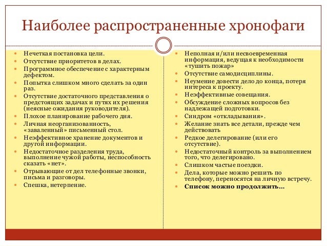 19. 19. Наиболее распространенные хронофаги  Нечеткая постановка цели.  Отсутствие приоритетов в делах.  Программное обеспечение с характерным дефектом.  Попытка слишком много сделать за один раз.  Отсутствие достаточного представления о предстоящих задачах и путях их решения (неясные ожидания руководителя).  Плохое планирование рабочего дня.  Личная неорганизованность, «заваленный» письменный стол.  Неэффективное хранение документов и другой информации.  Недостаточное разделения труда, выполнение чужой работы, неспособность сказать «нет».  Отрывающие от дел телефонные звонки, письма и разговоры.  Спешка, нетерпение.  Неполная и/или несвоевременная информация, ведущая к необходимости «тушить пожар»  Отсутствие самодисциплины.  Неумение довести дело до конца, потеря интереса к проекту.  Неэффективные совещания.  Обсуждение сложных вопросов без надлежащей подготовки.  Синдром «откладывания».  Желание знать все детали, прежде чем действовать  Редкое делегирование (или его отсутствие).  Недостаточный контроль за выполнением того, что делегировано.  Слишком частые поездки.  Дела, которые можно решить по телефону, переносятся на личную встречу.  Список можно продолжить…