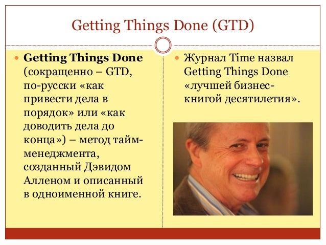 21. 21. Getting Things Done (GTD)  Getting Things Done (сокращенно – GTD, по-русски «как привести дела в порядок» или «как доводить дела до конца») – метод тайм- менеджмента, созданный Дэвидом Алленом и описанный в одноименной книге.  Журнал Time назвал Getting Things Done «лучшей бизнес- книгой десятилетия».