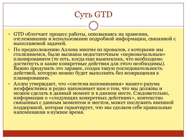 22. 22. Суть GTD  GTD облегчает процесс работы, основываясь на хранении, отслеживании и использовании подробной информации, связанной с выполняемой задачей.  По предположению Аллена многие из провалов, с которыми мы сталкиваемся, были вызваны недостаточным «первоначальным» планированием (то есть, когда еще выяснялось, что необходимо достигнуть и какие конкретные действия для этого необходимы). Важно продумать это заранее, создав такую последовательность действий, которую можно будет выполнить без возвращения к планированию.  Аллен утверждает, что «система напоминания» нашего разума неэффективна и редко напоминает нам о том, что мы должны и можем сделать в данный момент и в данном месте. Следовательно, информация о «следующих конкретных действиях», контекстно связанных с данным моментом и местом, может послужить внешней поддержкой, которая гарантирует, что мы сделаем себе правильные напоминания в нужное время.
