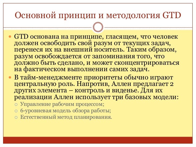 24. 24. Основной принцип и методология GTD  GTD основана на принципе, гласящем, что человек должен освободить свой разум от текущих задач, перенеся их на внешний носитель. Таким образом, разум освобождается от запоминания того, что должно быть сделано, и может сконцентрироваться на фактическом выполнении самих задач.  В тайм-менеджменте приоритеты обычно играют центральную роль. Напротив, Аллен предлагает 2 других элемента – контроль и виденье. Для их реализации Аллен использует три базовых модели:  Управление рабочим процессом;  6-уровневая модель обзора работы;  Естественный метод планирования.