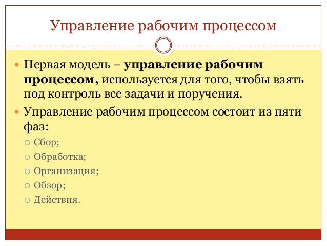 25. 25. Управление рабочим процессом  Первая модель – управление рабочим процессом, используется для того, чтобы взять под контроль все задачи и поручения.  Управление рабочим процессом состоит из пяти фаз:  Сбор;  Обработка;  Организация;  Обзор;  Действия.