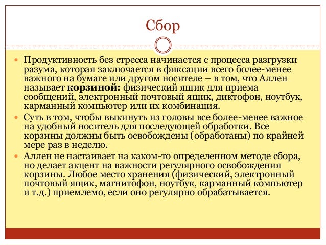 26. 26. Сбор  Продуктивность без стресса начинается с процесса разгрузки разума, которая заключается в фиксации всего более-менее важного на бумаге или другом носителе – в том, что Аллен называет корзиной: физический ящик для приема сообщений, электронный почтовый ящик, диктофон, ноутбук, карманный компьютер или их комбинация.  Суть в том, чтобы выкинуть из головы все более-менее важное на удобный носитель для последующей обработки. Все корзины должны быть освобождены (обработаны) по крайней мере раз в неделю.  Аллен не настаивает на каком-то определенном методе сбора, но делает акцент на важности регулярного освобождения корзины. Любое место хранения (физический, электронный почтовый ящик, магнитофон, ноутбук, карманный компьютер и т.д.) приемлемо, если оно регулярно обрабатывается.