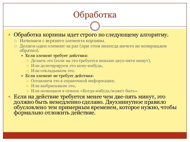 27. 27. Обработка  Обработка корзины идет строго по следующему алгоритму.  Начинаем с верхнего элемента корзины.  Делаем один элемент за раз (при этом никогда ничего не возвращаем обратно).  Если элемент требует действия:  Делаем это (если на это требуется меньше двух-пяти минут),  Или делегирируем это кому-нибудь,  Или откладываем это.  Если элемент не требует действия:  Оставляем это в справочной информации,  Или выбрасываем это,  Или помещаем в список «Когда-нибудь/может быть».  Если на действие требуется менее чем две-пять минут, это должно быть немедленно сделано. Двухминутное правило обусловлено тем примерным временем, которое нужно, чтобы формально отложить действие.