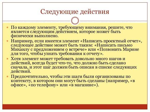 29. 29. Следующие действия  По каждому элементу, требующему внимания, решите, что является следующим действием, которое может быть физически выполнено.  Например, если имеется элемент «Написать проектный отчет», следующее действие может быть таким: «Написать письмо Михаилу с предложением о встрече» или «Позвонить Марине для того, чтобы узнать требования к отчету».  Хотя элемент может требовать довольно много шагов и действий, всегда будет что-то, что должно быть сделано сначала, и этот шаг должен быть описан в списке следующих действий.  Предпочтительно, чтобы эти шаги были организованы по контексту, в котором они могут быть сделаны (например, «в офисе», «по телефону» или «в магазине»).