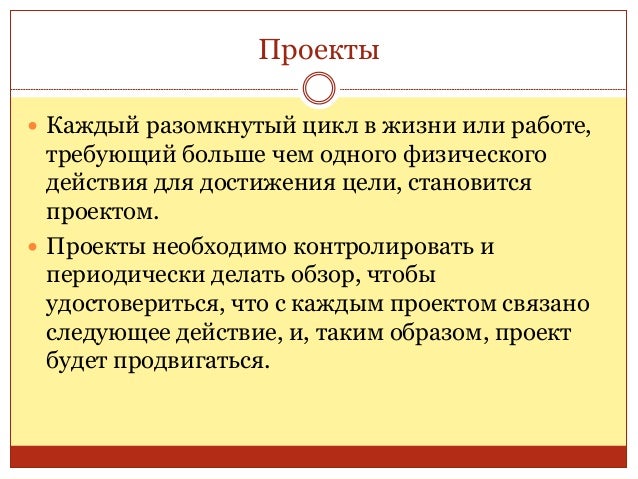 30. 30. Проекты  Каждый разомкнутый цикл в жизни или работе, требующий больше чем одного физического действия для достижения цели, становится проектом.  Проекты необходимо контролировать и периодически делать обзор, чтобы удостовериться, что с каждым проектом связано следующее действие, и, таким образом, проект будет продвигаться.